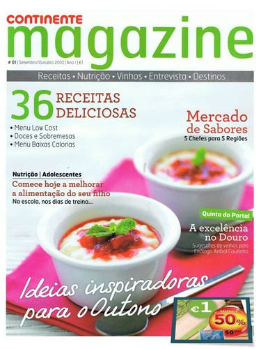 O Continente tem uma nova revista. É uma revista sobre receitas, nutrição, vinhos, entrevistas e destinos. Custa 1€, mas tem desconto de 50% em cartão.