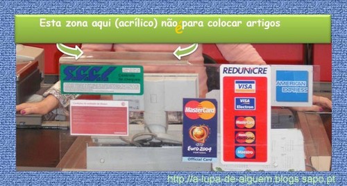 Lembro-me de logo nos primeiros tempos de trabalhar nesta empresa, ver um cliente partir o acrílico, quando colocava lá em cima um garrafão de cinco litros de água. Até acho que esta zona agora é mais forte. Mas mesmo assim, ontem uma cliente colocou lá em cima um pacote de detergente para a máquina e por momentos julguei que aquilo se ia partir, peguei logo no artigo. E a cliente ainda diz :"ah não se pode pôr aqui, é?" Bolas que é preciso ter paciência, então não se vê logo que não, afinal para que serve o tapete rolante!?