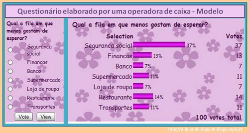 Finalmente chegamos aos 100 votos. Confesso que estava à espera que a maioria votasse na fila do supermercado como a que menos gostava de esperar. Mas como podem ver, a maioria gosta menos da fila da Segurança Social. Dos itens que eu coloquei no questionário ( e esqueci-me a do posto médico) os resultados foram:
