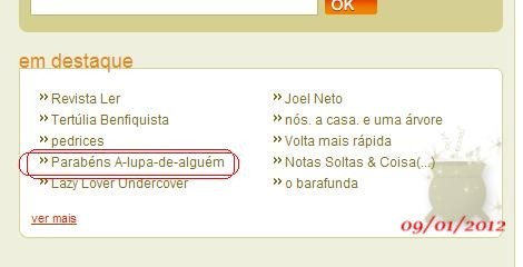 Mais uma vez agradeço à Equipa do Sapo blogs por este destaque. Considero-o com presente de blog-aniverásario pelo quarto ano a blogar na plataforma do Blogs Sapo e em"a lupa de alguém"!
